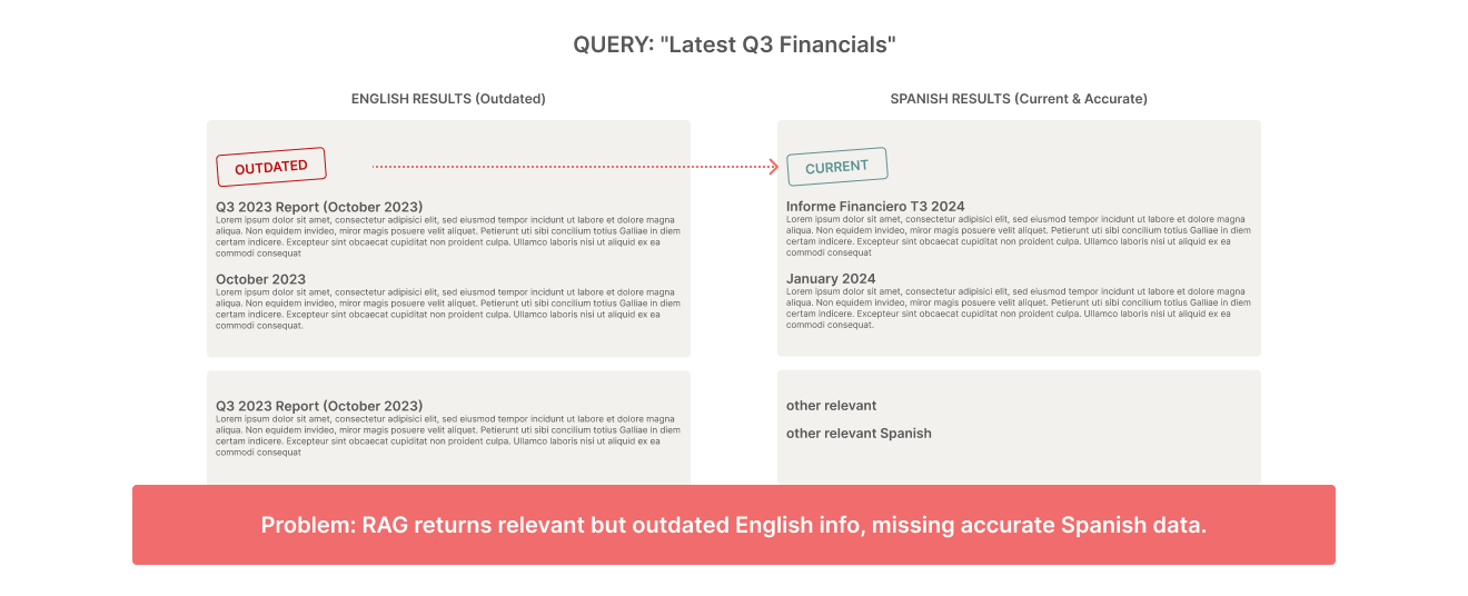 - Language bias: when both an English and Spanish chunk match, retrieval leans to English even if the Spanish version is more up to date or contextually complete.