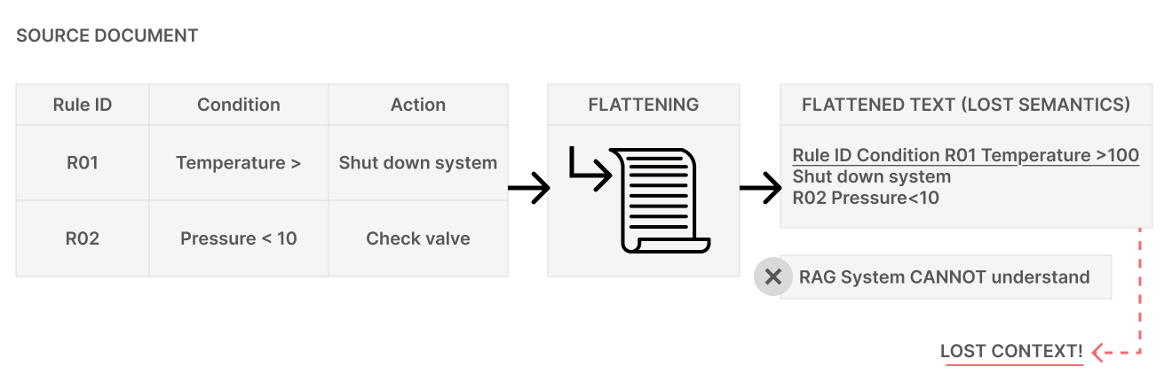 - Table flattening: columns get linearized; row relationships vanish; numeric constraints lose alignment.