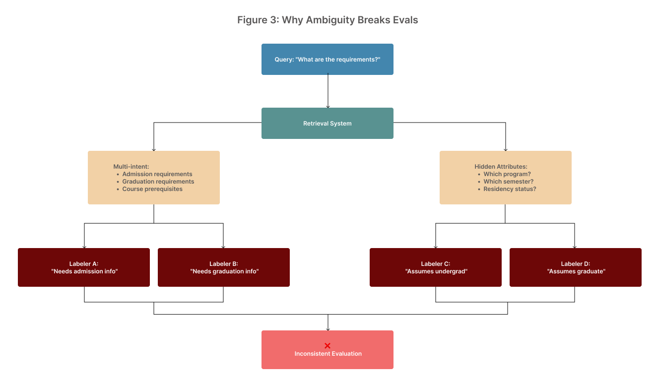 ❑ Ambiguous queries: evals penalize retrieval for missing hidden parameters.